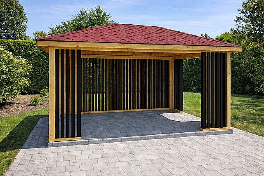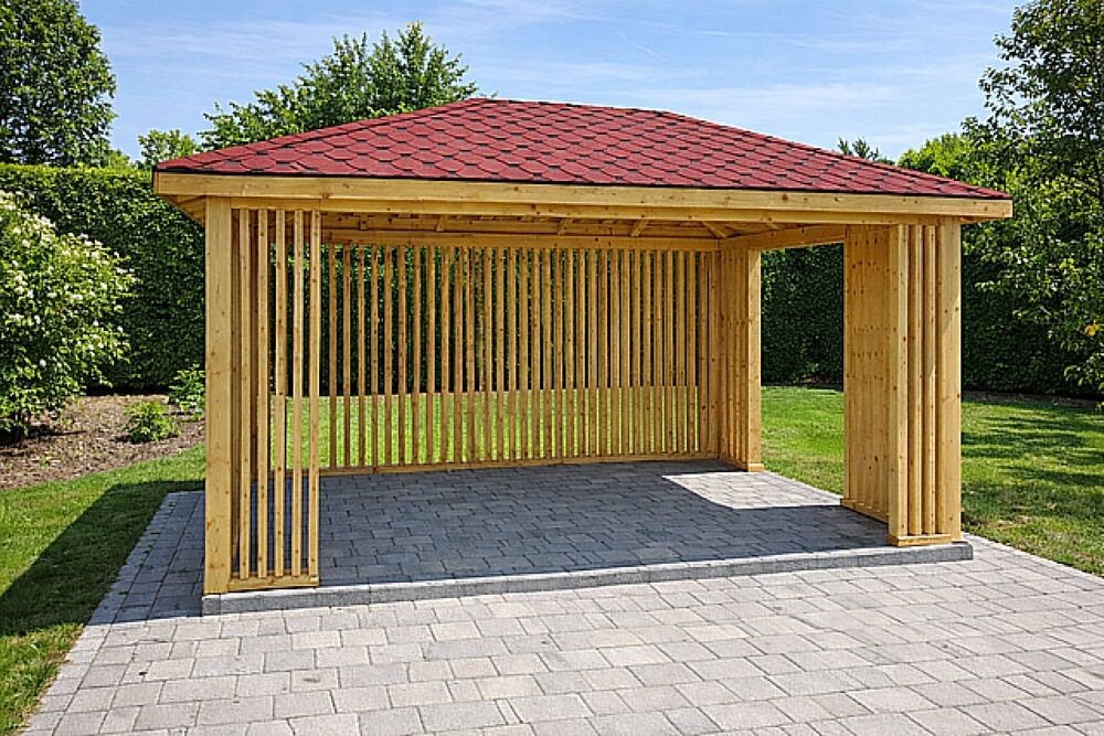 Połączenie klasycznej bryły z lamelowymi przesłonami zapewnia prywatność i ochronę przed wiatrem, jednocześnie zachowując przestronność i przewiewność. Dzięki dużym otworom okiennym altana pozostaje jasna i przyjazna.