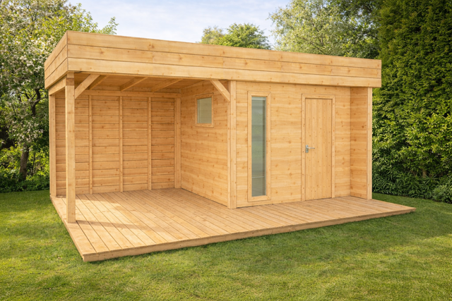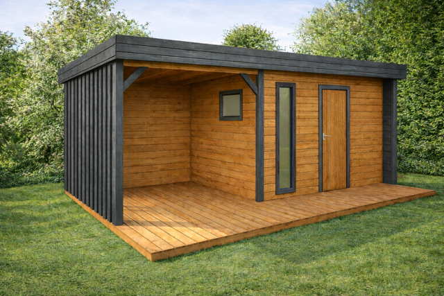 Oto model, który łączy nowoczesny design, naturalne drewno i zadaszony taras, tworząc idealne miejsce do relaksu na działce.